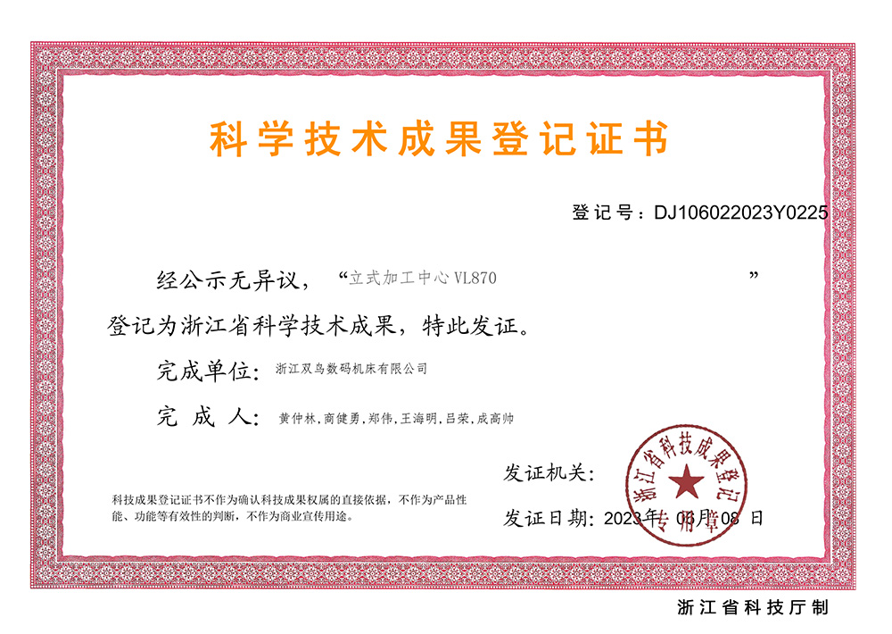 成果登記證書-立式加工中心 VL870- 浙江雙鳥數(shù)碼機(jī)床有限公司年產(chǎn)450臺(tái)數(shù)控機(jī)床建設(shè)項(xiàng)目(固廢部分)竣工環(huán)境保護(hù)驗(yàn)收公示