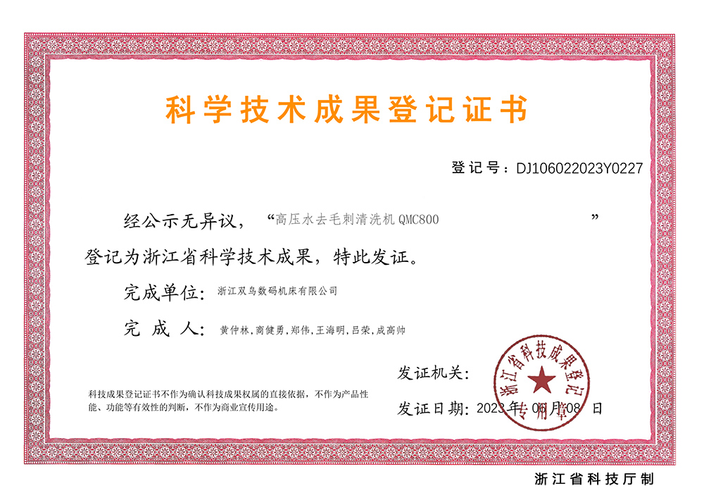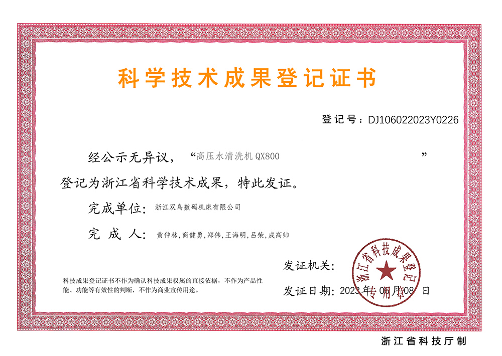 成果登記證書 -高壓水去毛刺清洗機(jī) QMC800