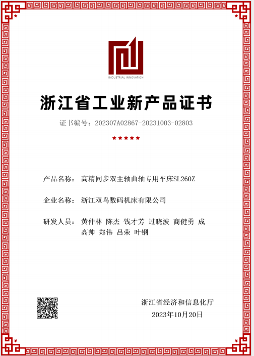 高精同步雙主軸曲軸專用車床SL260Z新產(chǎn)品評價(jià)證書