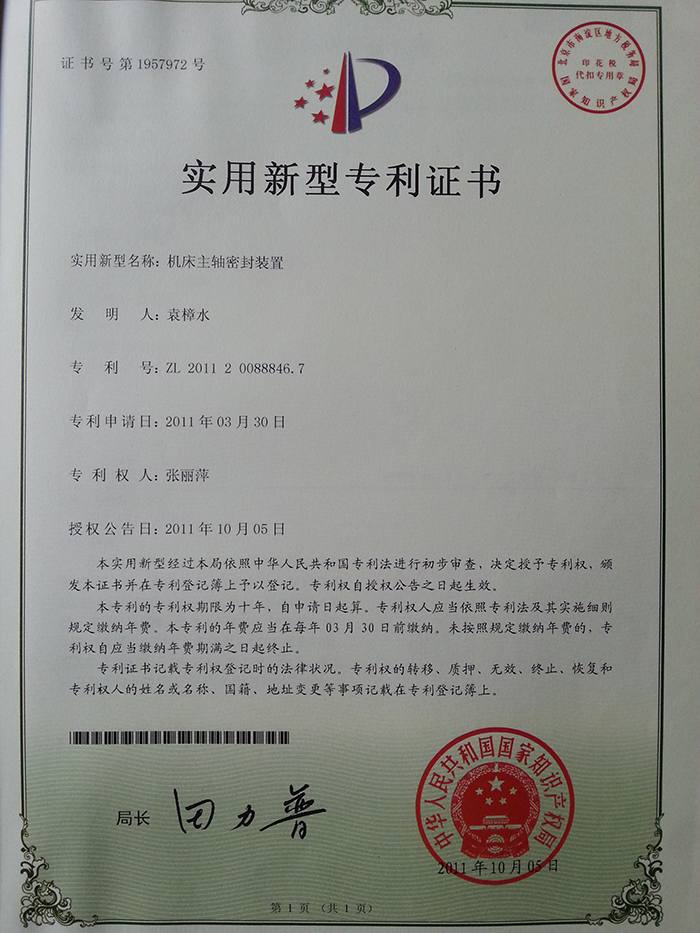 • 機床主軸密封裝置專利證書